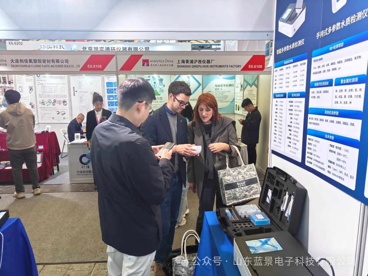 蓝景科技的展位前人头攒动,工作人员忙碌而有序地接待着每一位来访者。他们面带微笑,用专业的知识和热情的服务,向来宾们介绍着公司的新产品和技术。通过现场演示和应用介绍,让大家充分感受到了蓝景科技在水质检测领域的深厚实力。