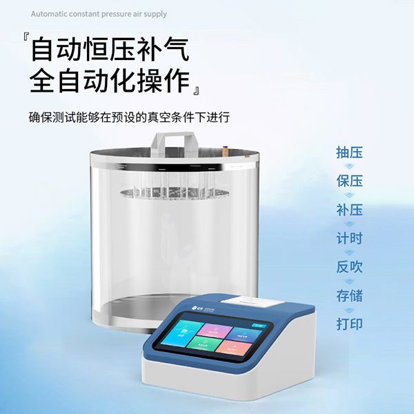 2.自动恒压补气,进一步确保测试能够在预设的真空条件下进行,抽压、保压、补压、计时、反吹、存储、打印全自动化一键操作;